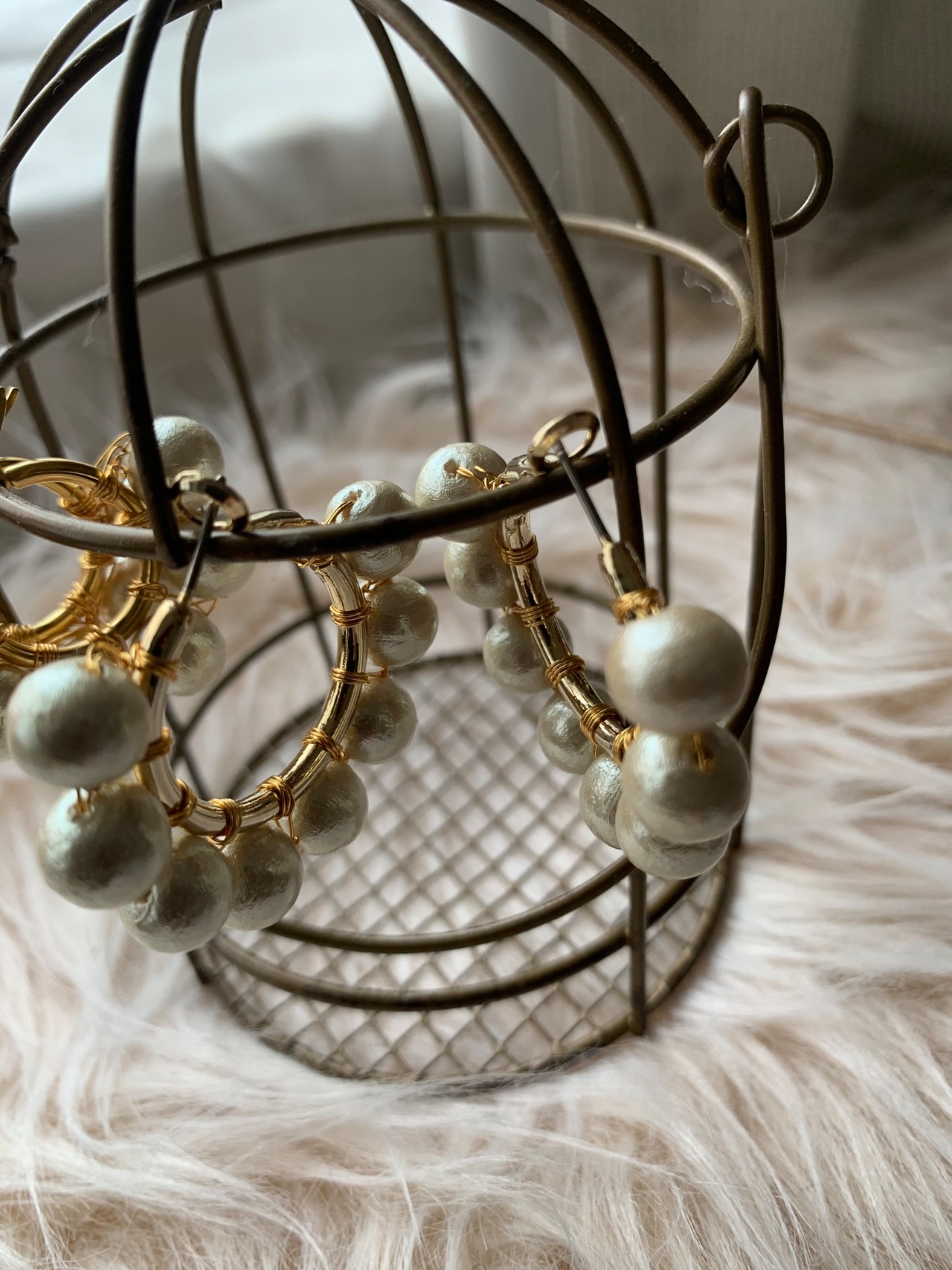 デイリーにもお出かけにも使いやすいフープタイプにコットンパールさんをいっぱいくっつけた可愛いけどゴージャスさもあるピアスです。