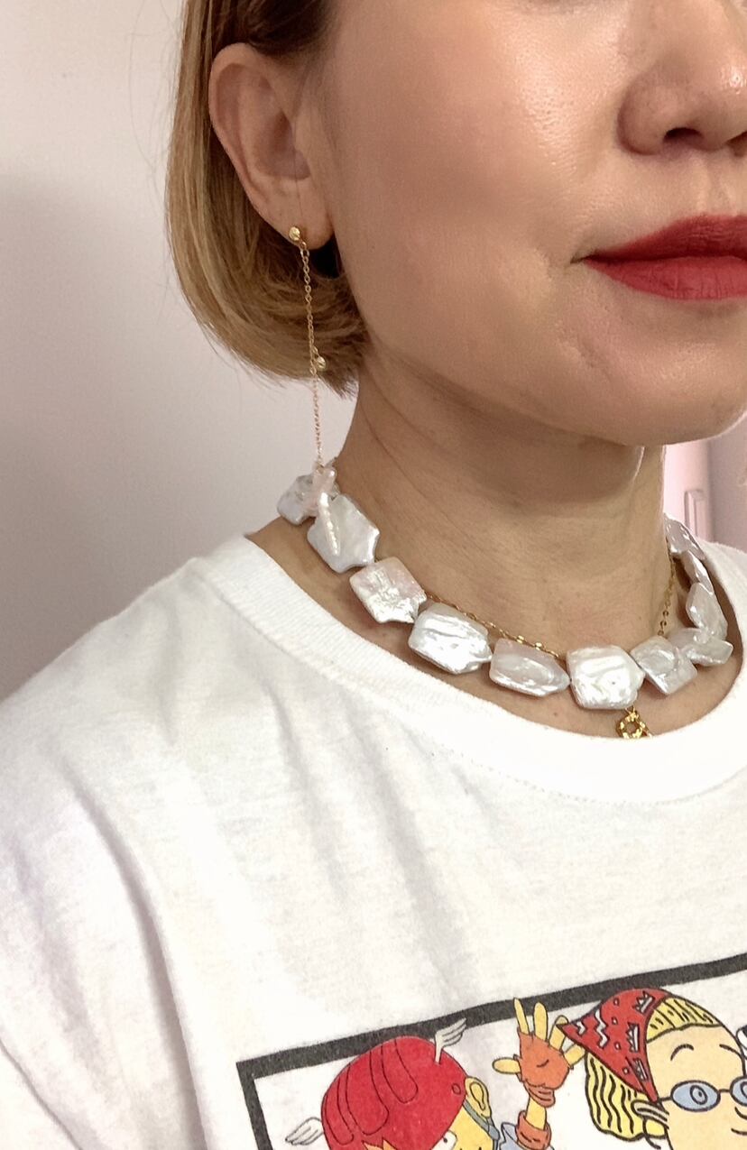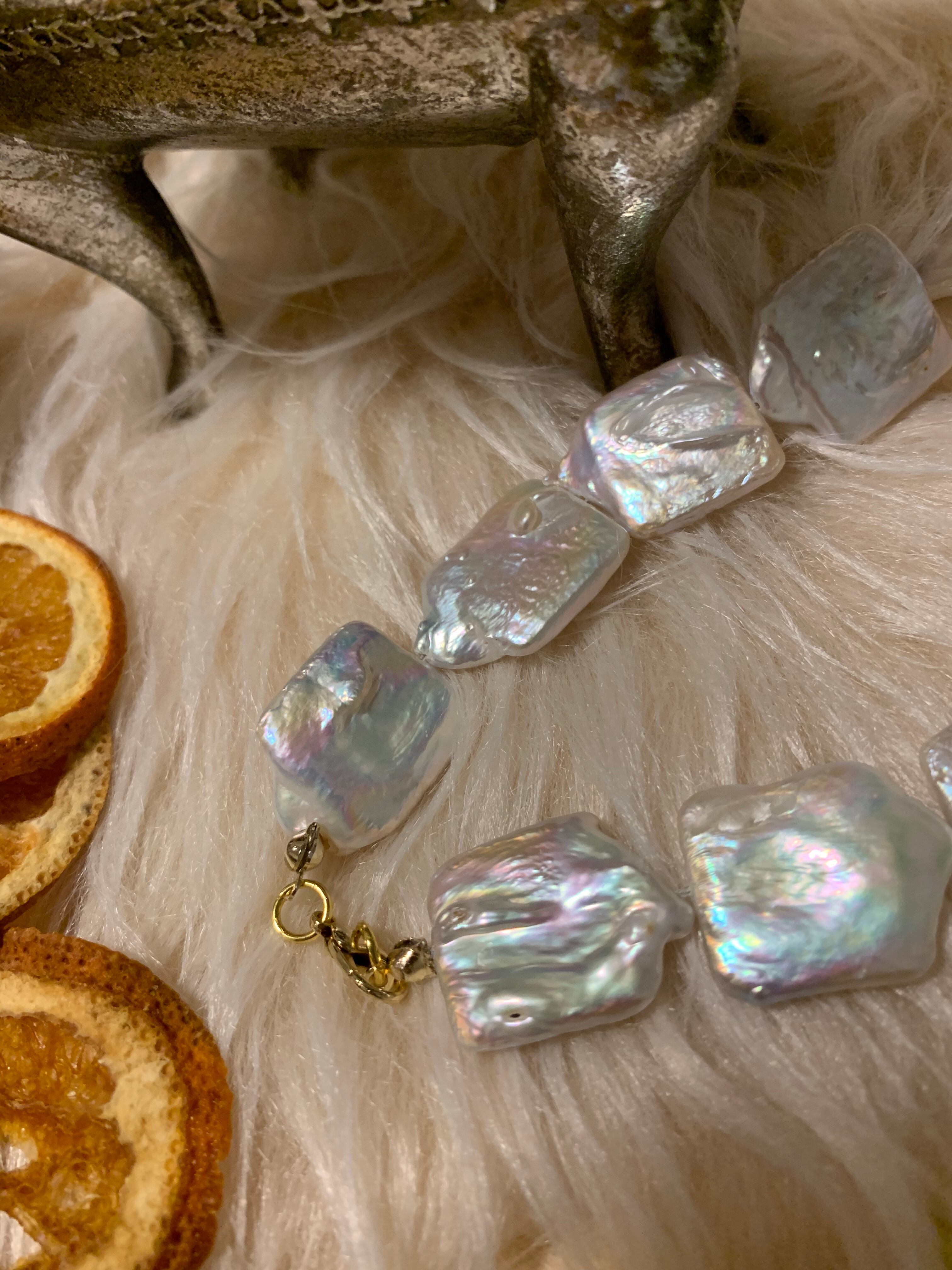 インパクトのある大粒の長方形淡水パールを17粒使った大人のネックレスです。