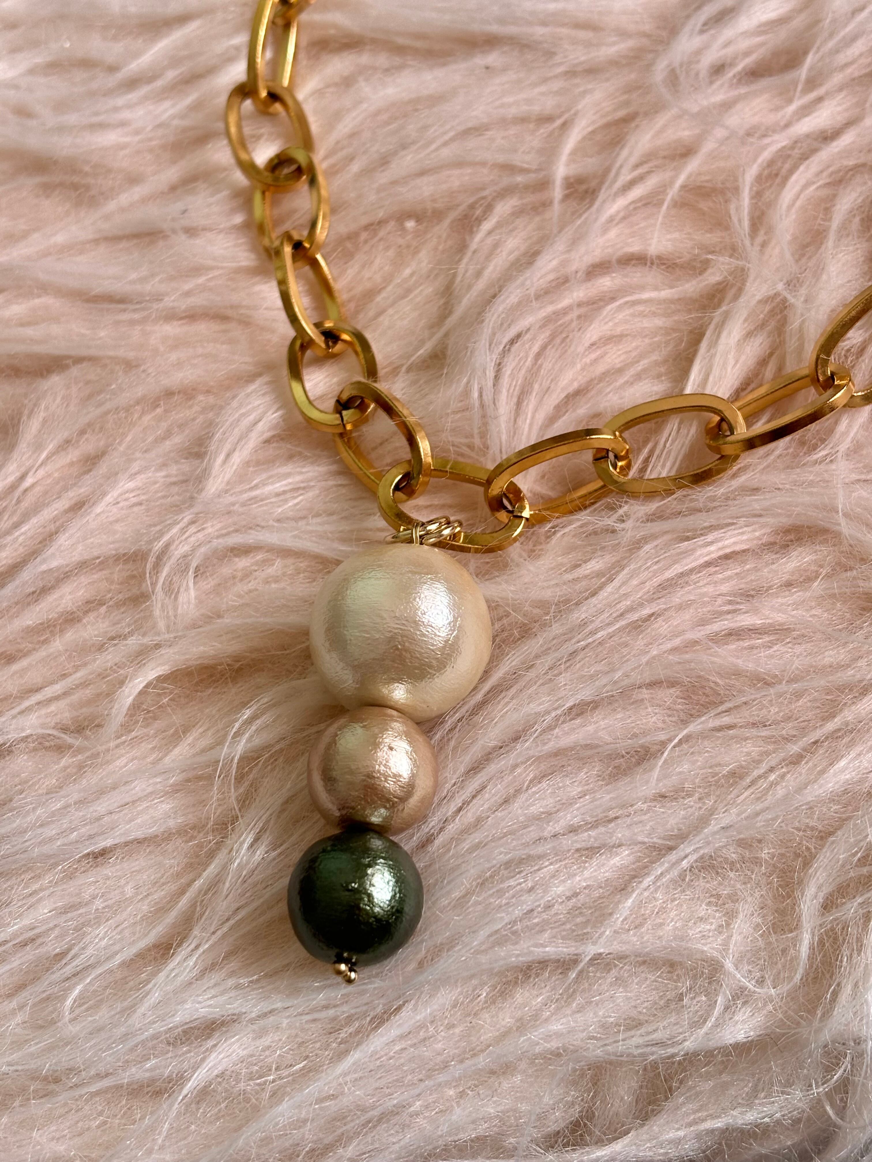 長さ45㎝(調整可) コットンパール20ミリ玉(キスカ)14ミリ玉(ゴールド)14ミリ玉(グリーン)