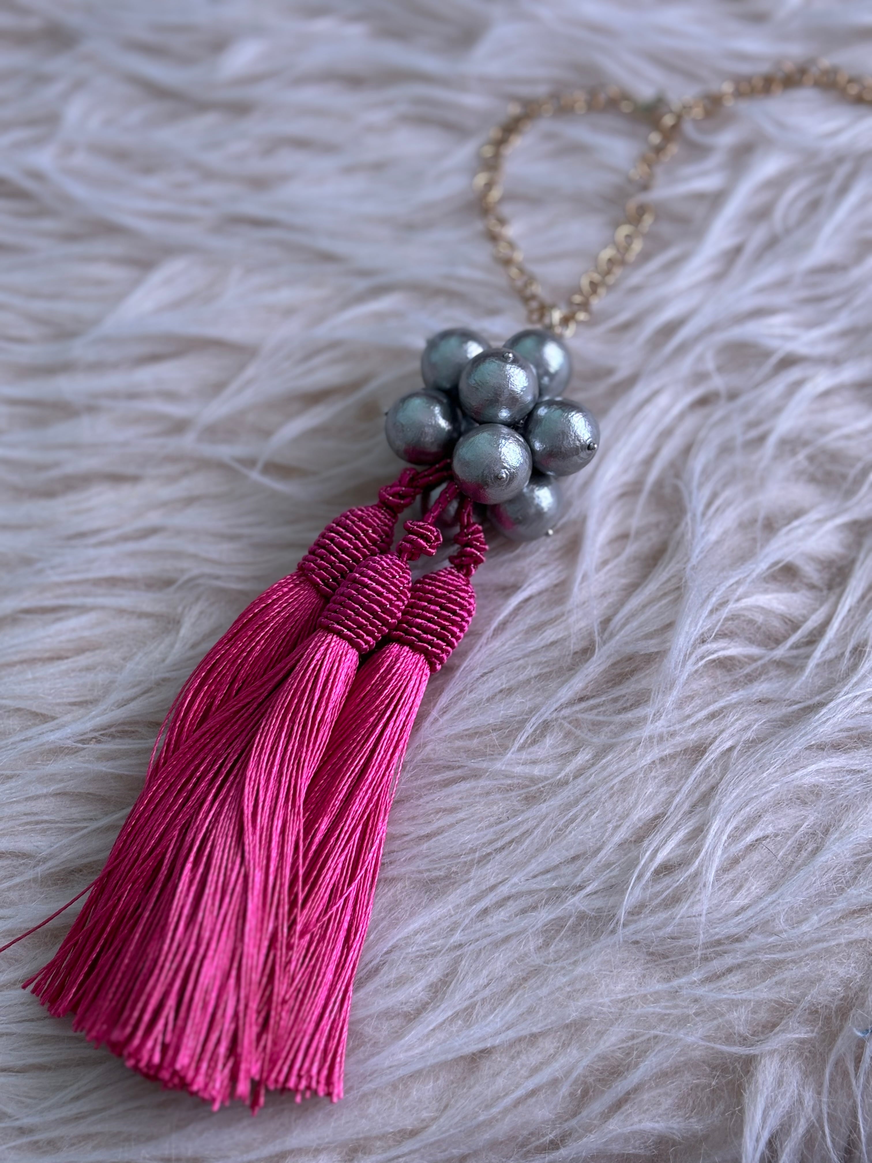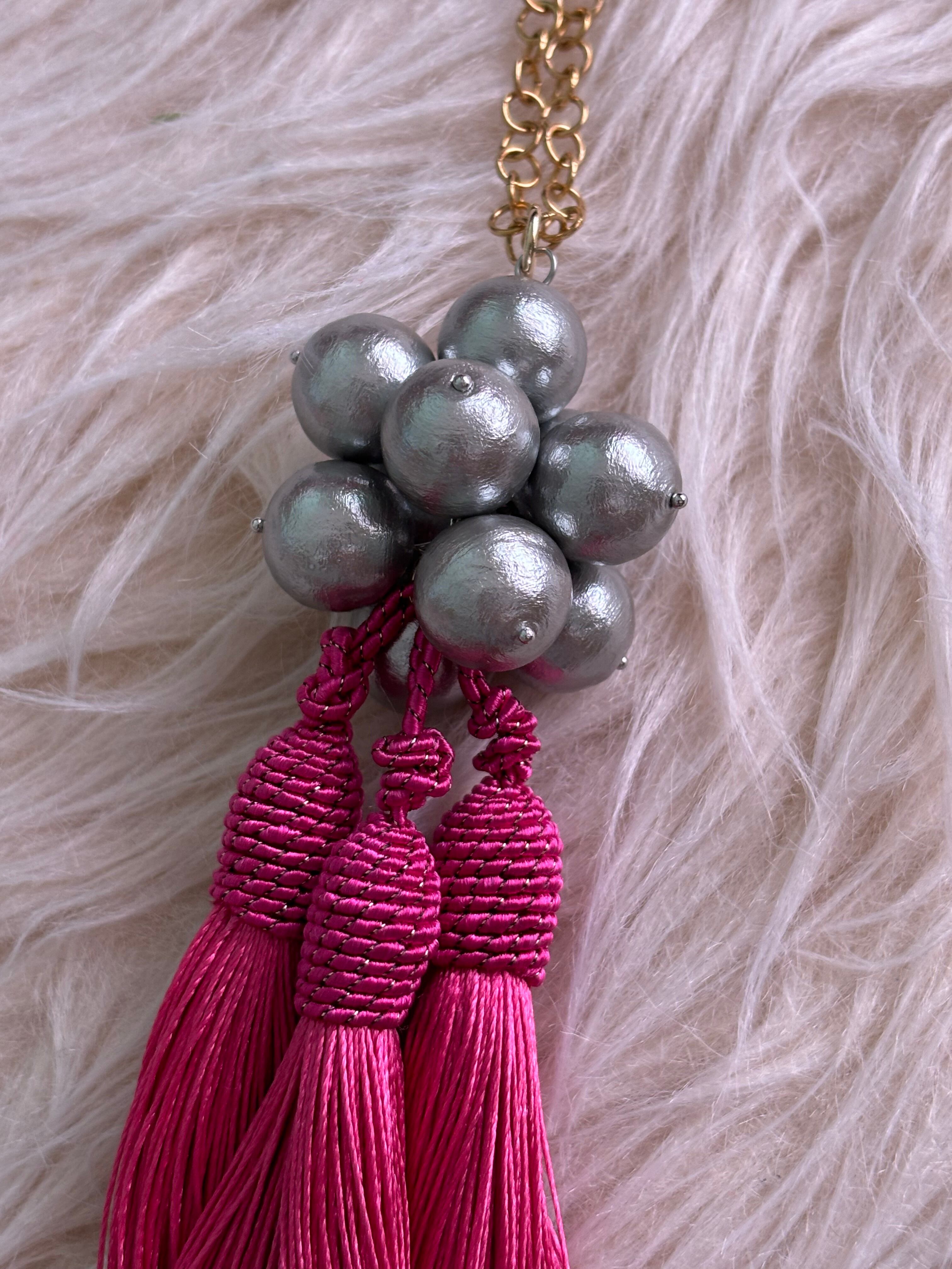 コットンパールつぶつぶチャームは、上品な輝きと可愛らしいデザインが特徴のバッグチャームです。手作り感溢れるつぶつぶのコットンパールチャームと、ボリューム感のあるタッセルが絶妙なバランスで組み合わさっています。シンプルながらも華やかさを演出する一品です。